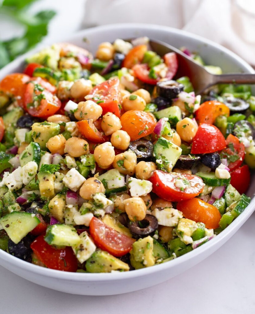 This Greek chickpea feta salad is a flavorful combination of protein-rich chickpeas and tangy feta cheese. Fresh vegetables and herbs add brightness, making it a refreshing and satisfying dish.