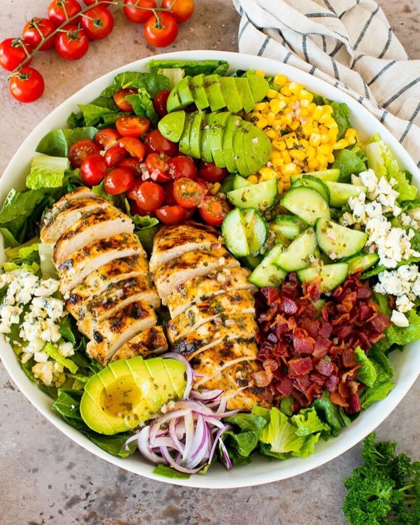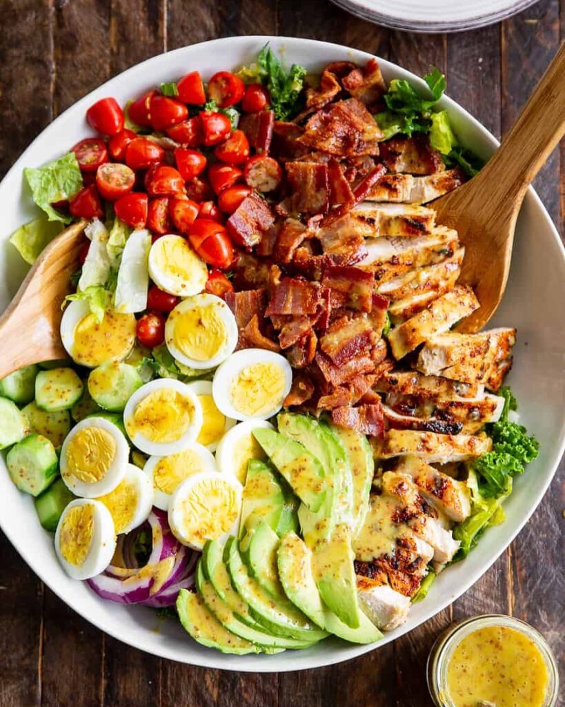 This high protein Cobb salad is loaded with a variety of ingredients like chicken, eggs, and fresh vegetables. Each bite offers a mix of flavors and textures, making it both satisfying and delicious.