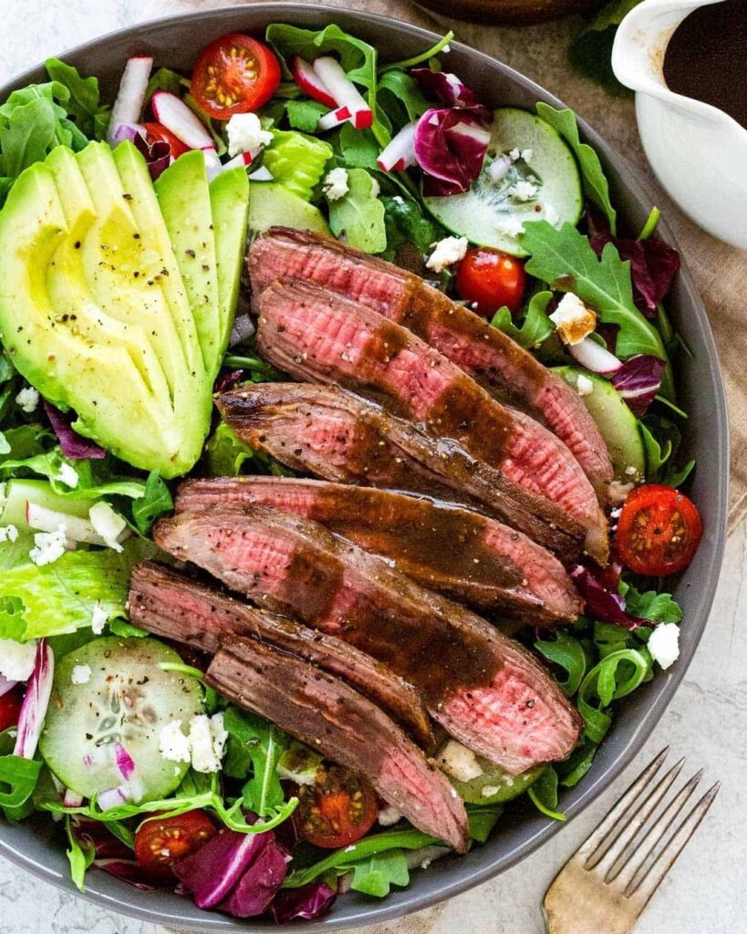 This grilled steak salad is a hearty, protein-rich option perfect for satisfying bigger appetites. Tender slices of steak are paired with crisp greens and fresh vegetables, creating a balanced meal that feels both filling and flavorful.