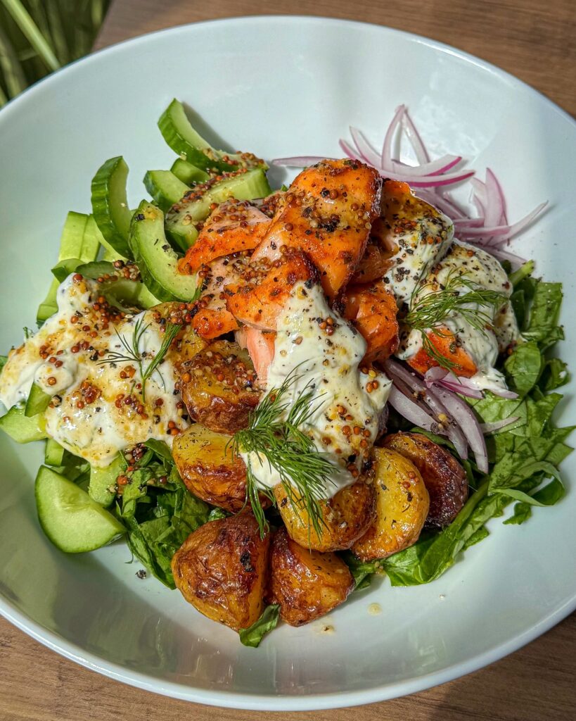 This salmon avocado salad is rich in protein and healthy fats, offering a nourishing and satisfying meal. The tender salmon pairs beautifully with creamy avocado and crisp greens for a balanced dish.