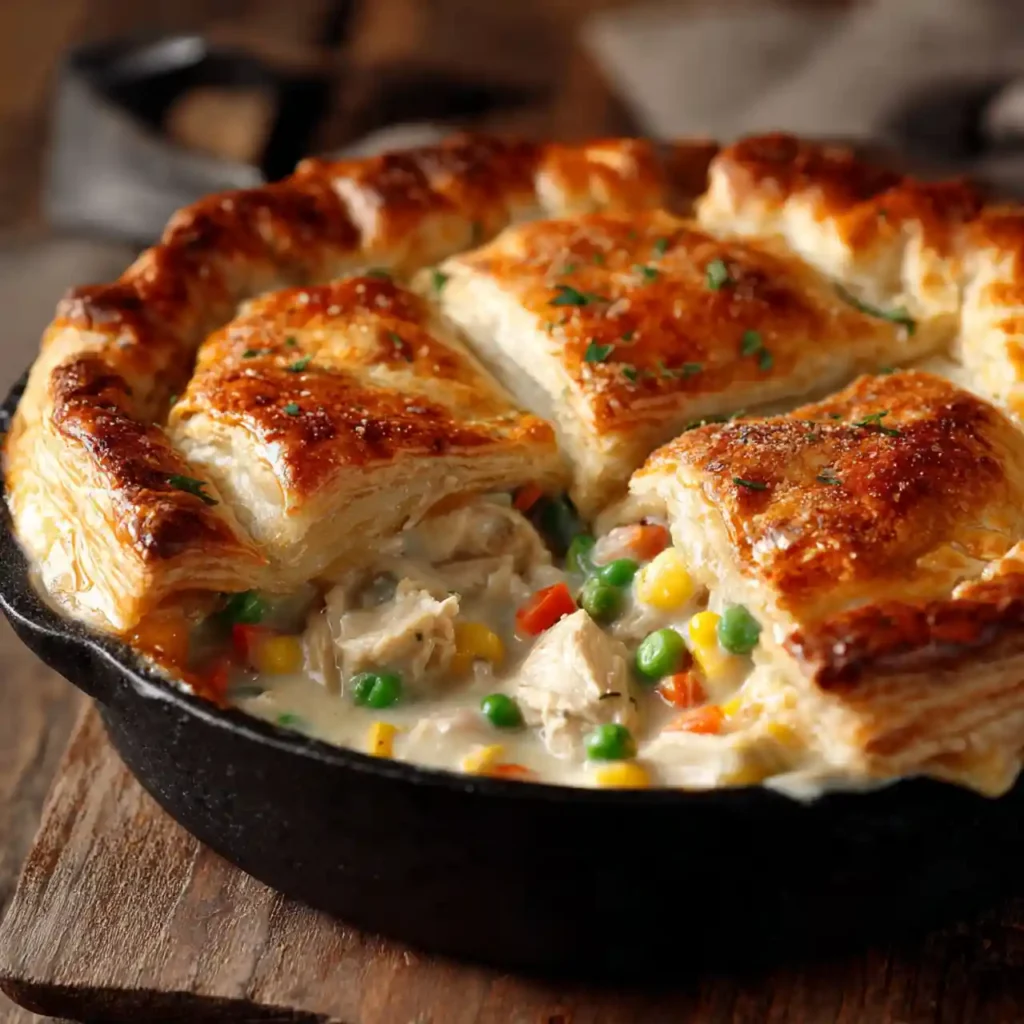 Using puff pastry creates a lighter, crispier finish while keeping the classic comfort-food flavors of chicken pot pie, making it ideal for easy family dinners or special occasions.