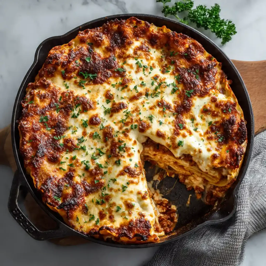 Skillet lasagna is a one-pan stovetop version of classic lasagna made with broken lasagna noodles, savory meat sauce, and melted cheese. It delivers all the comfort of traditional lasagna with less time and cleanup.
