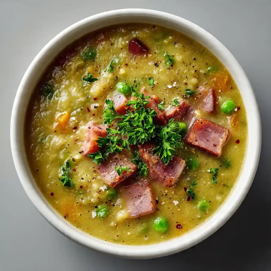 Split pea soup with ham is a thick, hearty soup made from dried split peas, smoky ham, and vegetables simmered until rich and creamy.